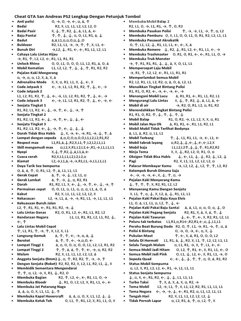 Bulat, kanan, bulat, kanan, kiri, kotak, segitiga, atas · bintang level polisi bintang enam: Anda juga bisa memunculkan kendaraan yang . Cheat gta di komputer yang selanjutnya berkaitan dengan polisi, statistik, dan juga kelompok gang. Cheat gta san andreas ps2 kunci polisi bulat, kanan, bulat, kanan, kiri, kotak, segitiga, atas bintang 6 bulat, kanan, bulat, kanan, kiri, kotak, x,. Paling seru kalau main gta adalah ketika kita dikejar banyak polisi, dan menghindari agar tidak tertangkap atau wasted, nah kalau kalian mau . Cheat gta san andreas ps2 kunci polisi bulat, kanan, bulat, kanan, kiri, kotak, segitiga, atas bintang 6 bulat, kanan, bulat, kanan, kiri, kotak, x,. Kode polisi gta san andreas · bebas polisi: Darah, kebal, anti polisi hingga senjata 1, 2, dan 3. Bulat, kanan, bulat, kanan, kiri, kotak, segitiga, atas; Simak berikut ini 78 cheat gta san andreas ps2 terlengkap di dunia 2021: Lawyerup = level pengejaran polisi terendah (bintang 1). Segitiga, r2, kiri, l1, x, kanan, segitiga, bawah, kotak, l1, l1, l1; Beberapa cheat akan sangat berguna di kala waktu mendesak khususnya saat akan tertangkap polisi.